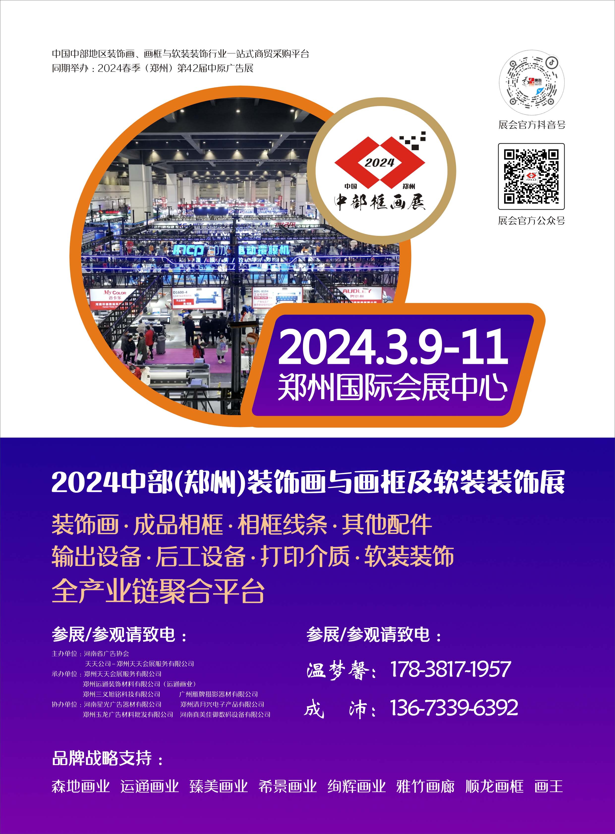 展會(huì)繼續(xù)與主辦方天天公司旗下知名展會(huì)——中原廣告展同期同地舉辦,兩展同開(kāi),有助于打通行業(yè)渠道,延伸裝飾畫(huà)、畫(huà)框與軟裝裝飾領(lǐng)域產(chǎn)品的深度,通過(guò)天天公司獨(dú)有的大數(shù)據(jù)庫(kù)營(yíng)銷(xiāo)和推廣宣傳手段,繼續(xù)為廣大展商提供精準(zhǔn)的內(nèi)銷(xiāo)市場(chǎng)拓展服務(wù),是廣大廠(chǎng)商、代理商、經(jīng)銷(xiāo)商、品牌企業(yè)集中維護(hù)老客戶(hù)、拓展新客戶(hù)的高回報(bào)平臺(tái)。